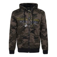 Mens sweat jacket lined with warm berber fleece, large print on chest, kangaroo pockets, contrasting cuffs, attached hood, Uncle Sam Label